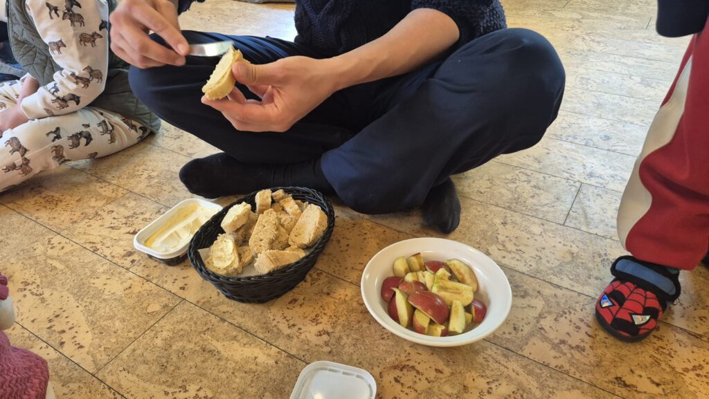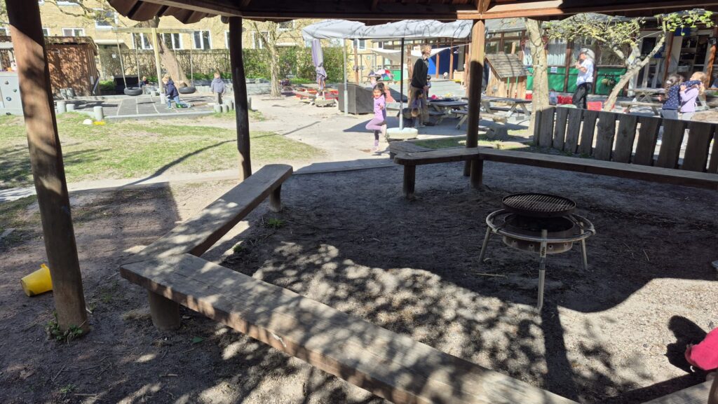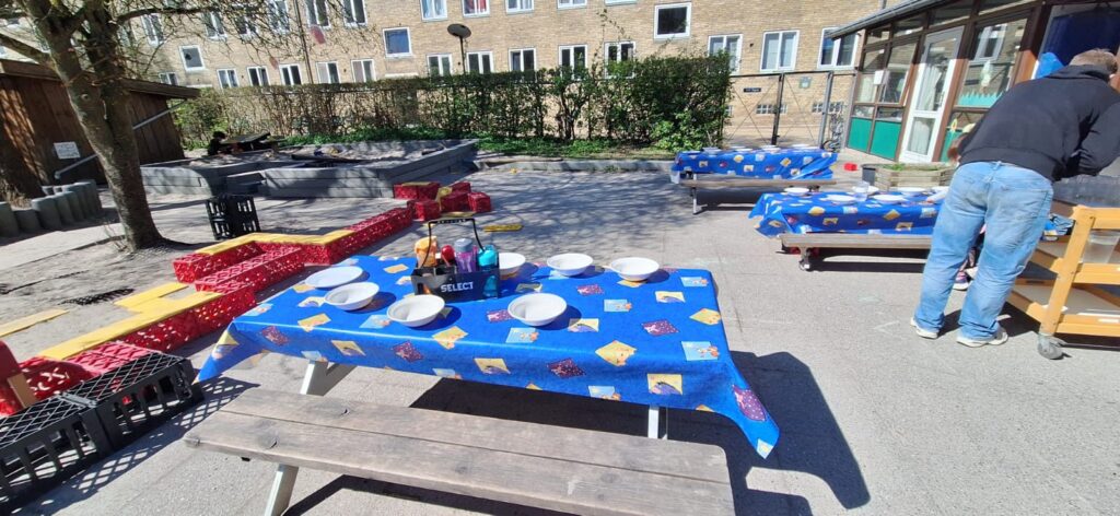 Lapsed avaldasid soovi süüa õues, ning seda mõtet asuti kohe ka koos lastega teoks tegema. Kusagilt tiriti hoovi keskele pingid, õpetaja tõi toast vaksturullid ning mõõtis ja lõikas koos lastega laudadele vakstud, ühiselt loendati sööjad ja kaeti lauad. Imeline kevadilm, söögiks kuskuss, kalafilee, mangokaste ja brokkoli-lillkapsas-kõik söödi ära! Kokaks Iraani juurtega aga enamus elu Taanis elanud mees. Söögiajal istus igas lauas koos lastega üks täiskasvanu, juhendas neid sõbralikult ning arendas nendega mõnusat vestlust elust ja asjadest.