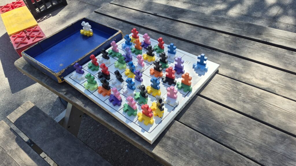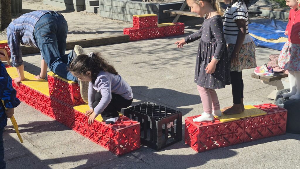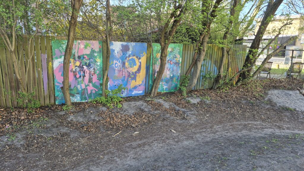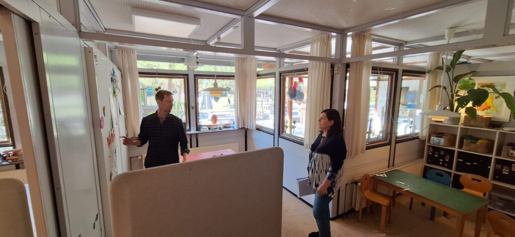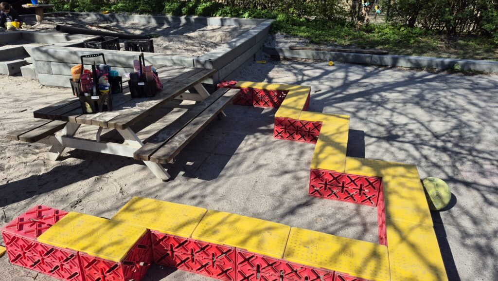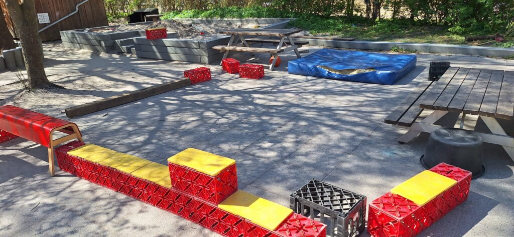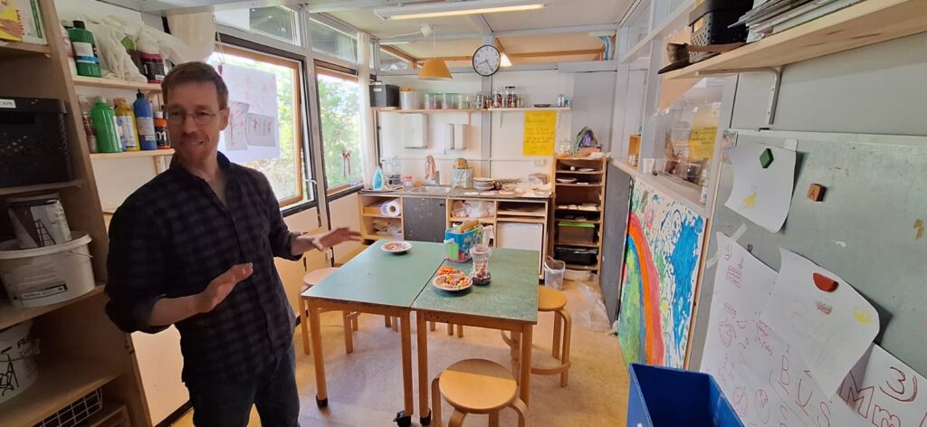 Lasteaia direktor Niklas kunstiruumis. Üks sein on lastele vabamaalimiseks. Direktori lootus on, et ehk see arendab nende loovust ja ühtlasi vähendab soovi teiste ruumide seintele joonistada 🙂 Punastest kastidest ehitatud Super Mario takistusrada arendab tasakaalu ja loovust.