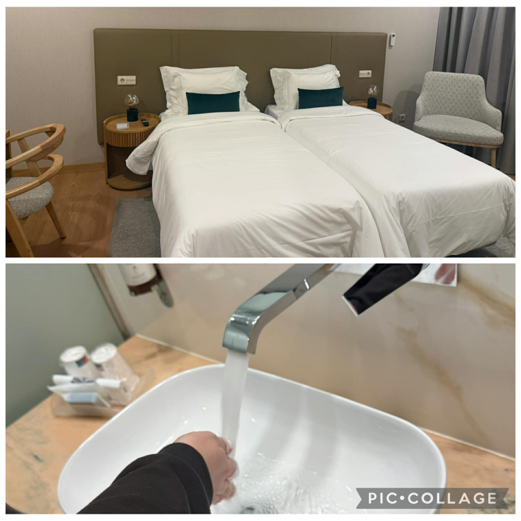 Sooja vee mure sai lahenduse. Peale remondimehe käiku oli meil soe vesi olemas, aga seda rõõmu jätkus umbes tunniks. Hiljem kadus vesi jälle ja õhtu sisustasime mööda treppe kohvritega joostes, mis oli tegelikult väga hea jätk eelnevale jõusaalitreeningule. AGA me ei kurda, sest meile anti viimase peal tuba. See on uus ja super ilus. Nüüd on meil lausa sellised mugavused, et toas on külmkapp ja mullivann. OK, nali, mullivanni pole. Igatahes- lõpp hea, kõik hea.
